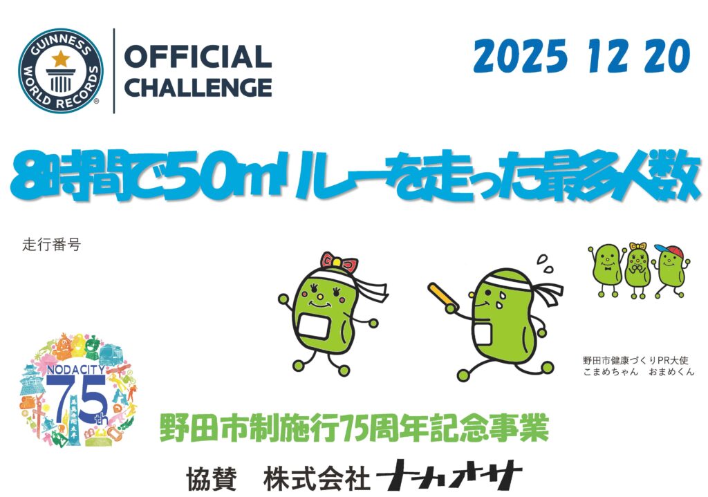 株式会社ナカオサは、2025年12月20日(土)に開催された「野田市制施行75周年記念事業」の一環として実施された、ギネス世界記録™への挑戦イベントにおいて、参加者用ゼッケンの協賛を行いました。